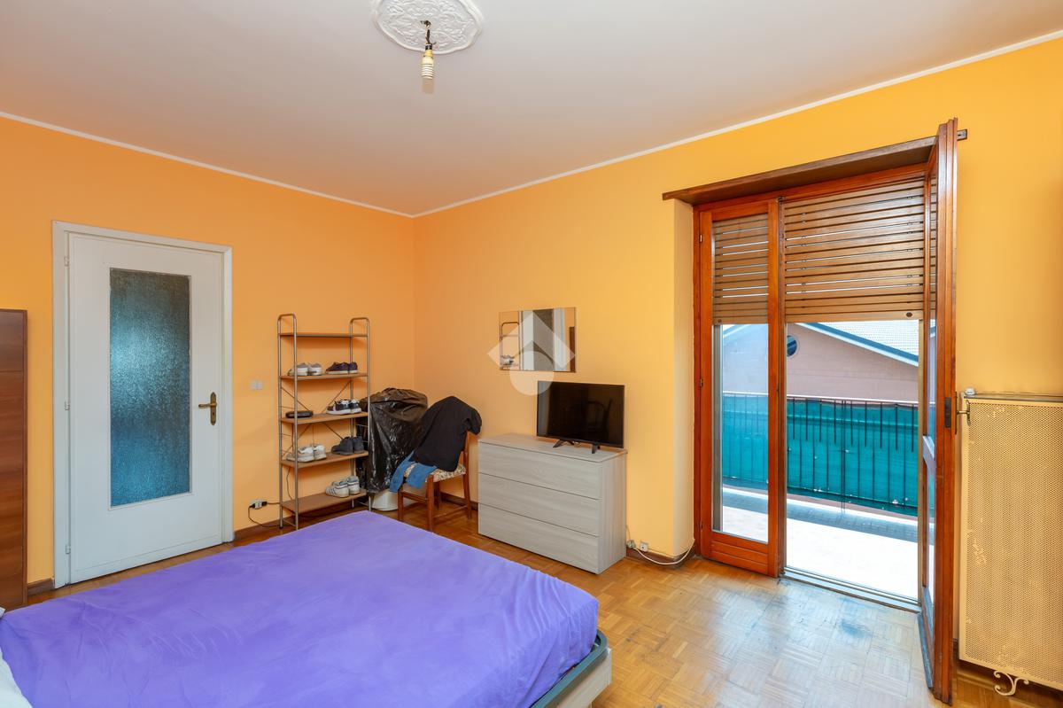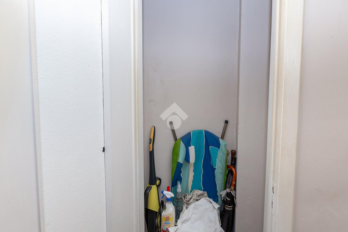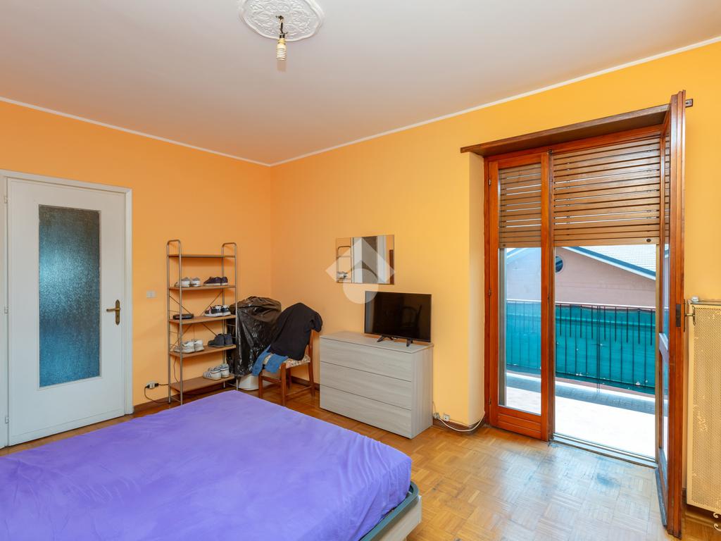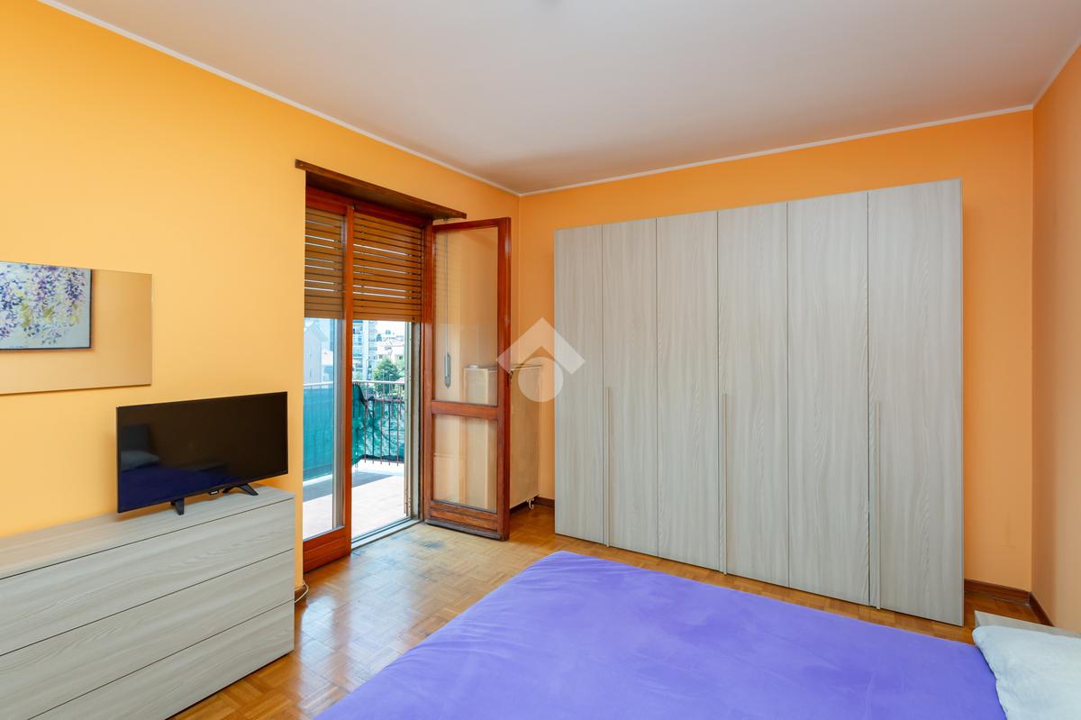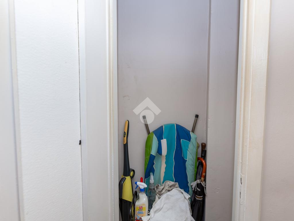Proseguendo troviamo la camera da letto, anch'essa molto ampia, ben squadrata con i soffitti di 3 metri di altezza, di conseguenza facilmente arredabile con la pavimentazione in parquet, molto luminosa per via della porta finestra con affaccio sul secondo balcone con vista aperta su Piazza Dolci dove il giovedì mattina fanno il mercato. Tramite il disimpegno abbiamo lo sgabuzzino molto ampio con la possibilità di poterlo scaffalare.