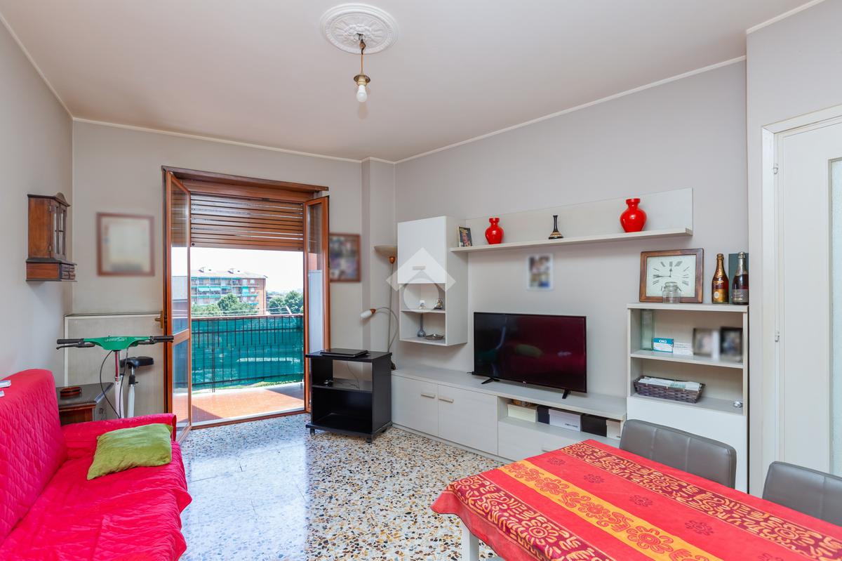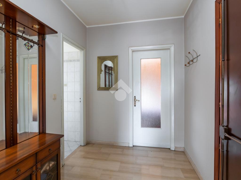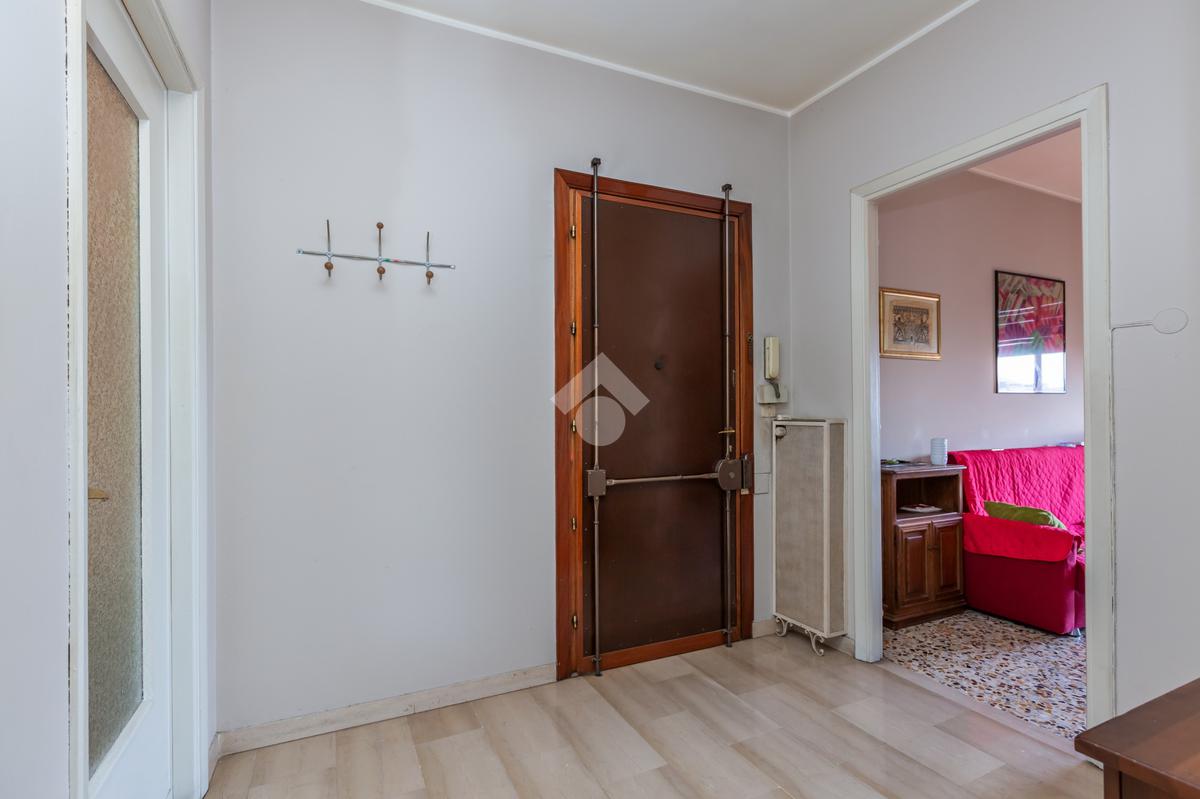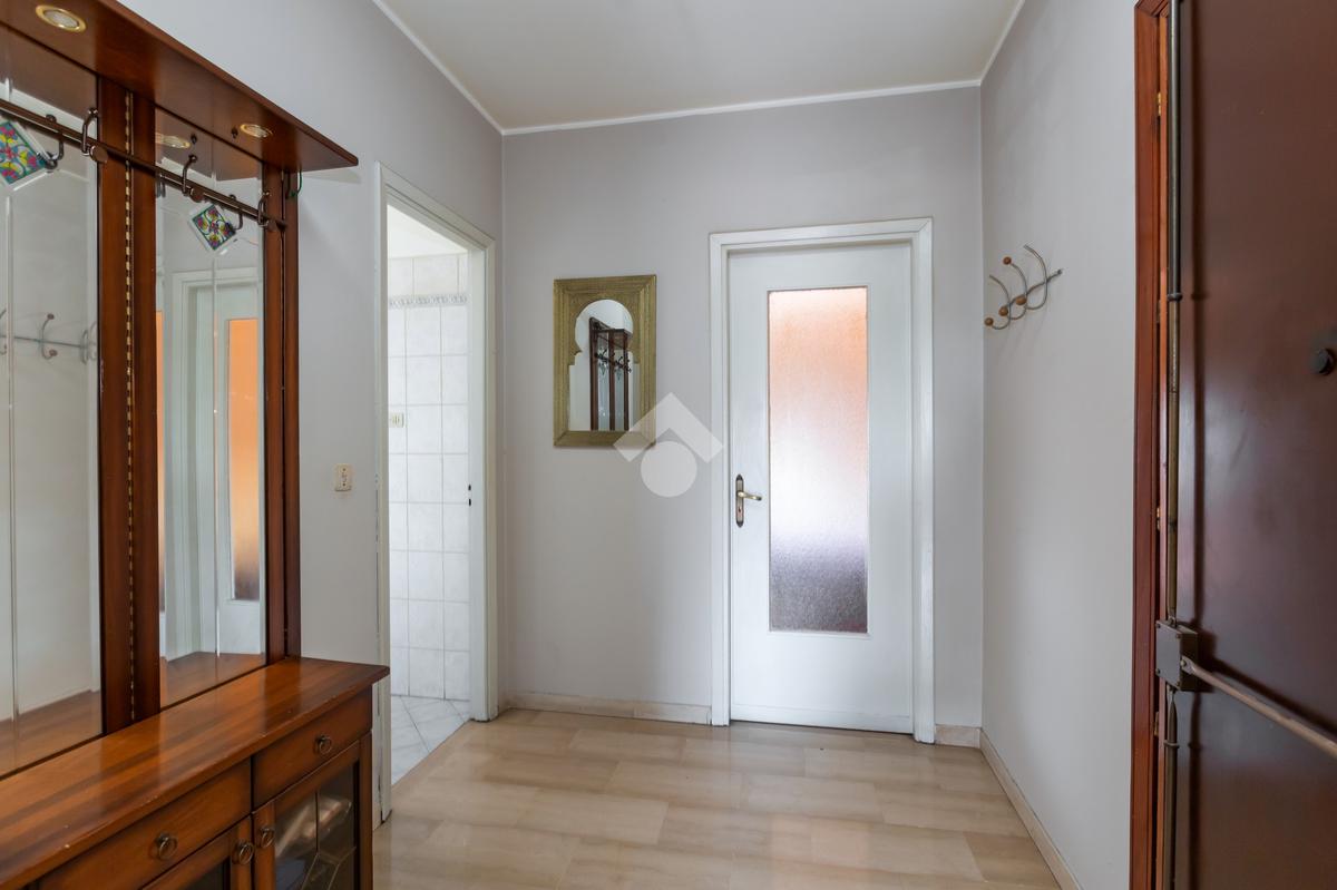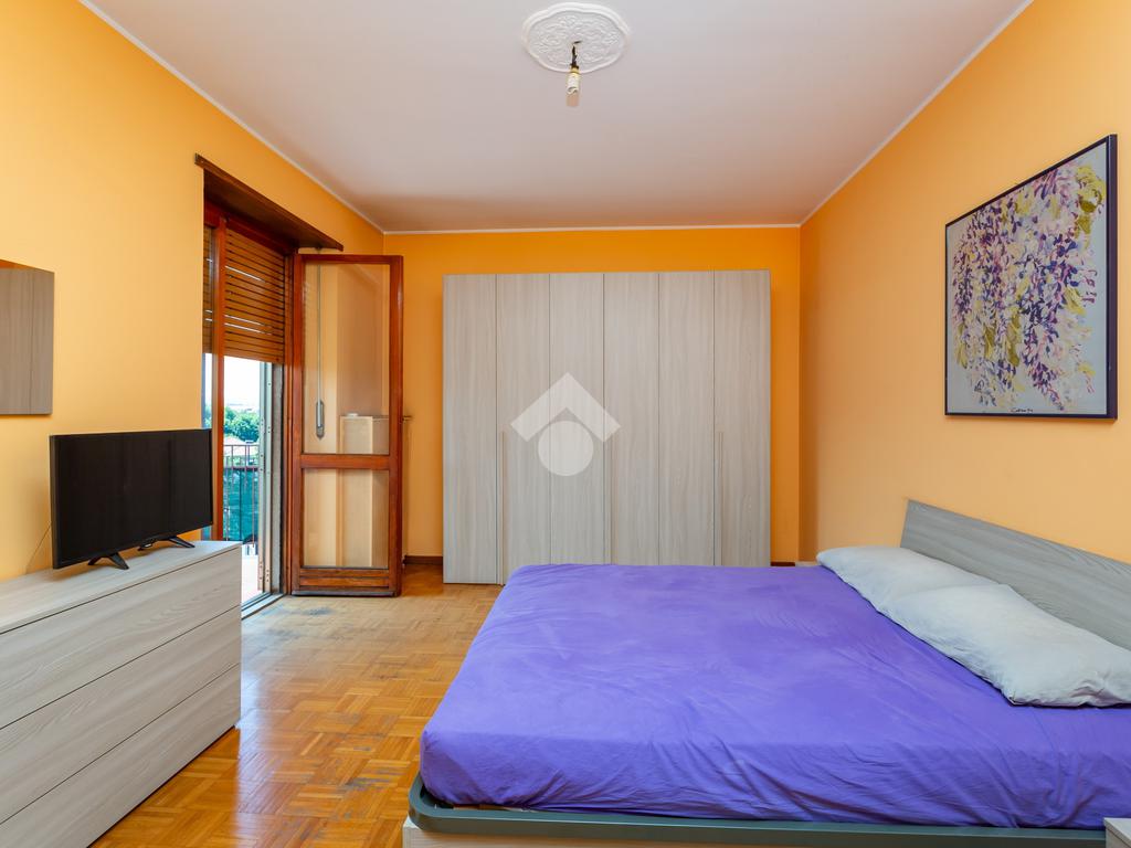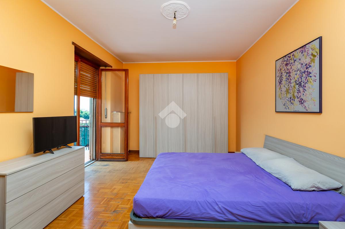 Proseguendo troviamo la camera da letto, anch'essa molto ampia, ben squadrata con i soffitti di 3 metri di altezza, di conseguenza facilmente arredabile con la pavimentazione in parquet, molto luminosa per via della porta finestra con affaccio sul secondo balcone con vista aperta su Piazza Dolci dove il giovedì mattina fanno il mercato. Tramite il disimpegno abbiamo lo sgabuzzino molto ampio con la possibilità di poterlo scaffalare.