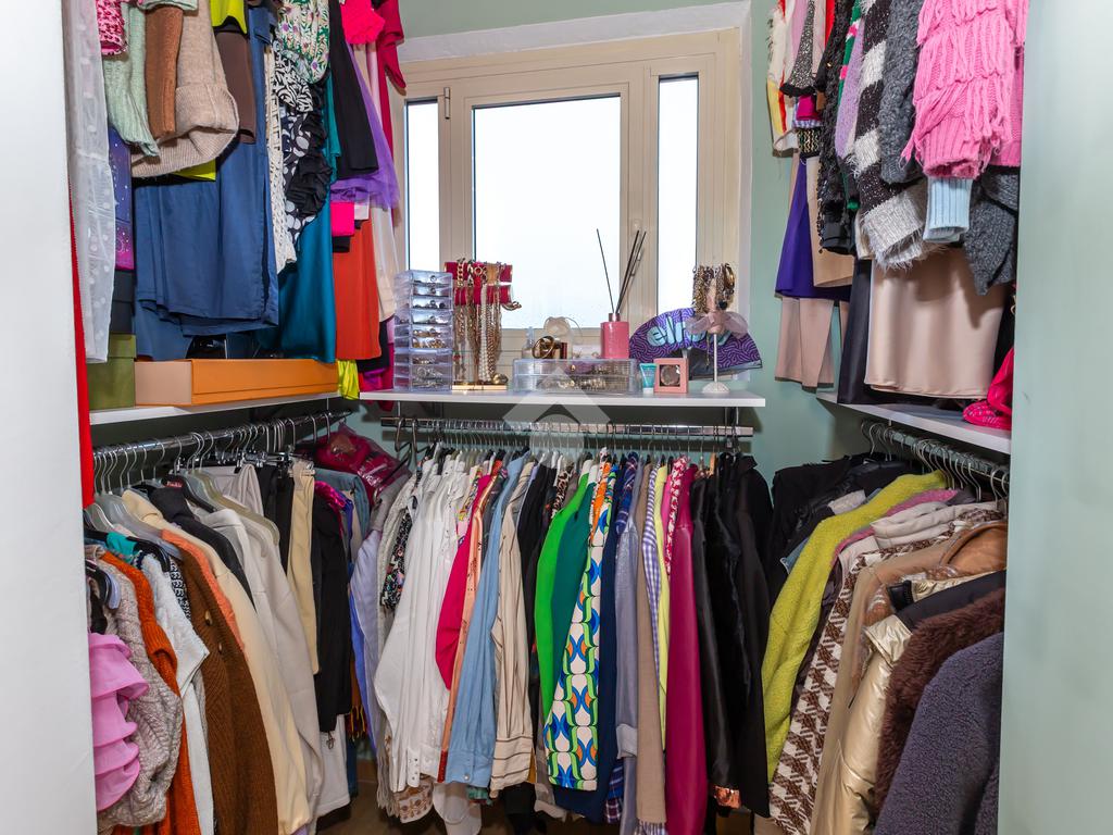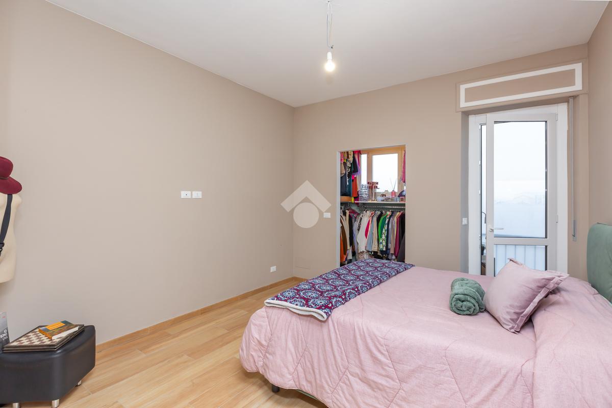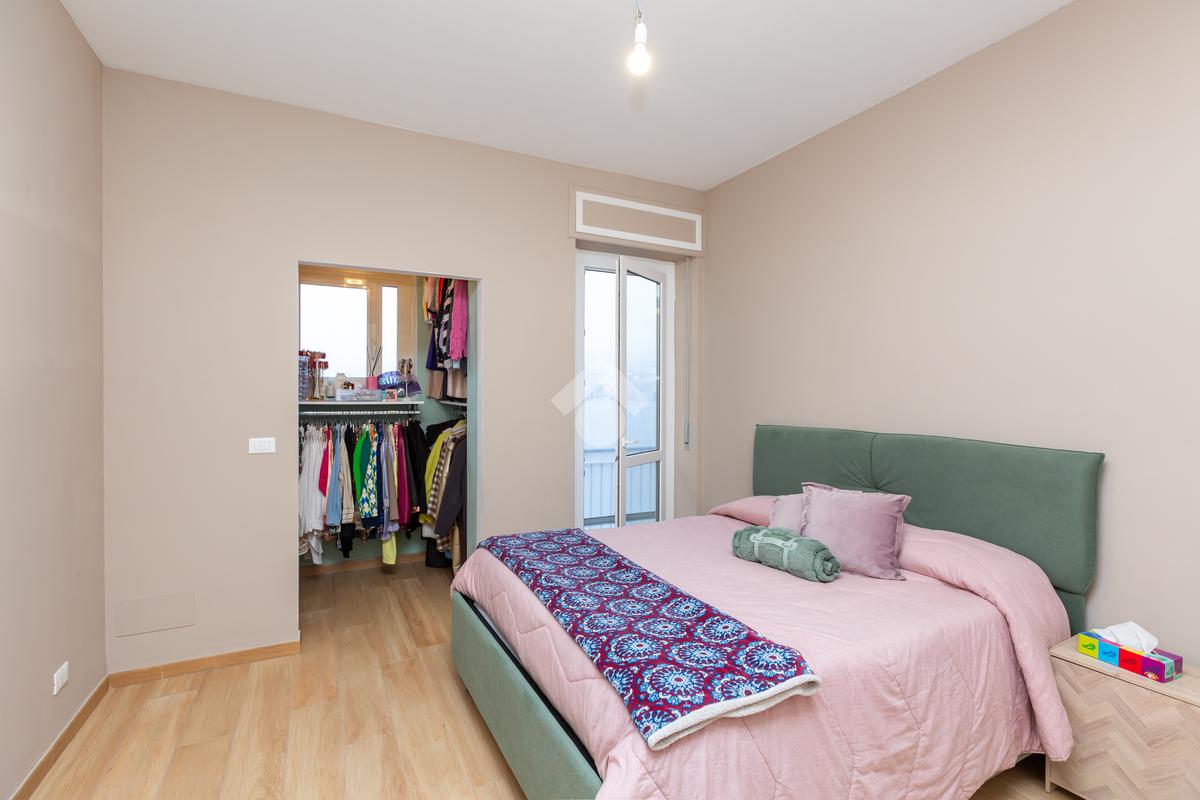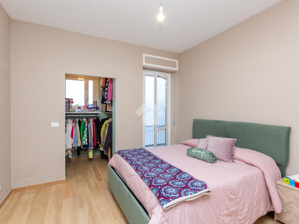 L’appartamento è situato al quarto piano senza ascensore, composto di ingresso living su luminosa zona giorno con cucina a vista e penisola con accesso al primo balcone; la camera da letto matrimoniale, dotata di cabina armadio, dà affaccio su secondo balcone completo di tenda invernale; bagno moderno con box doccia e finestra.