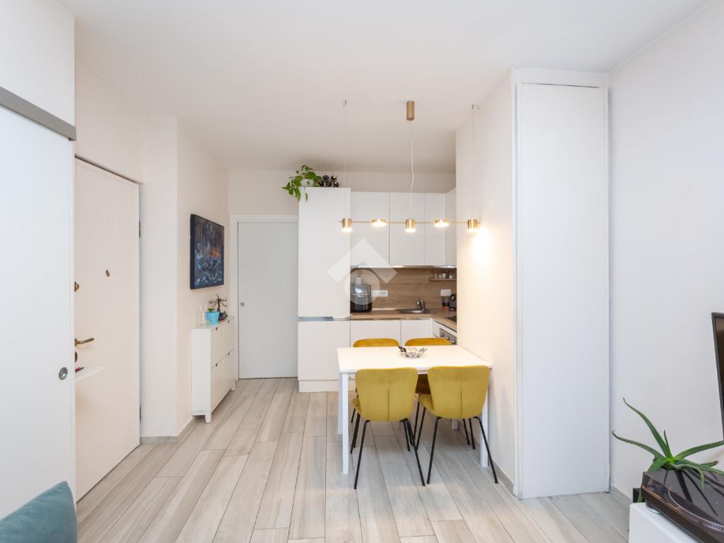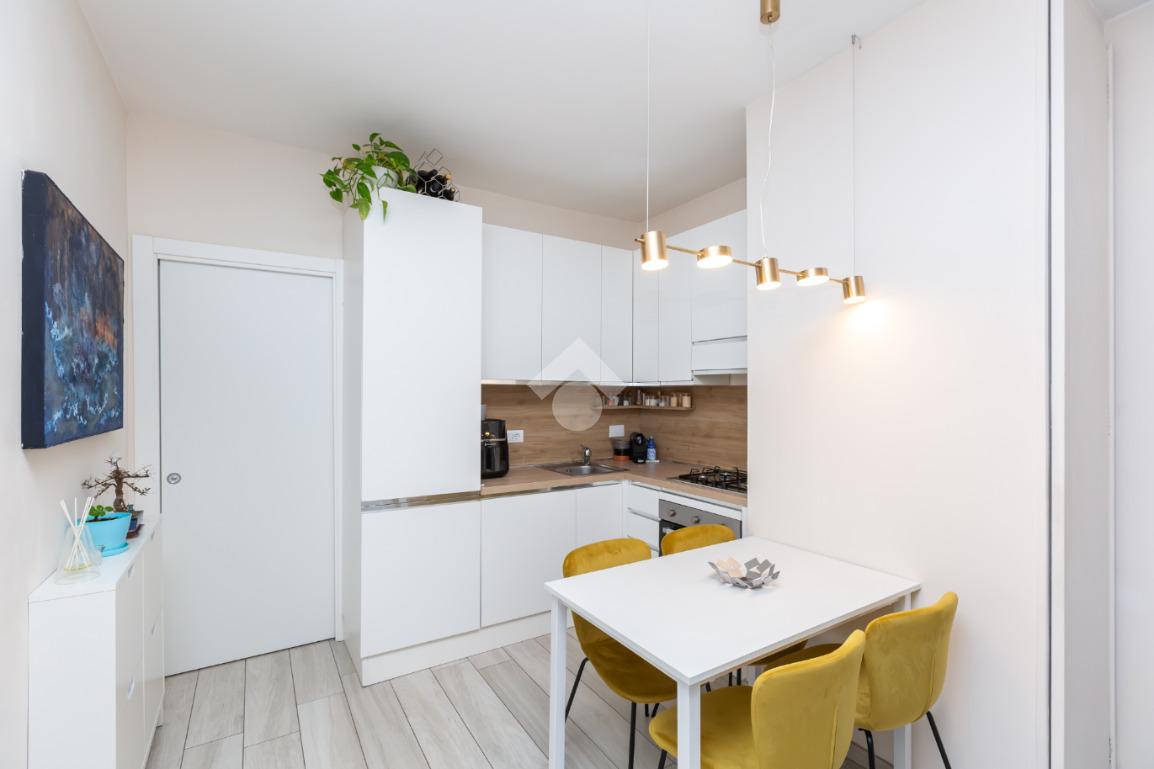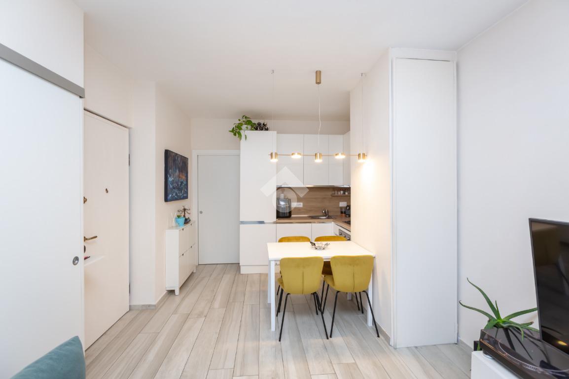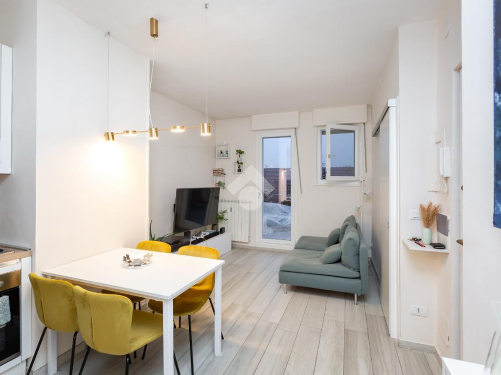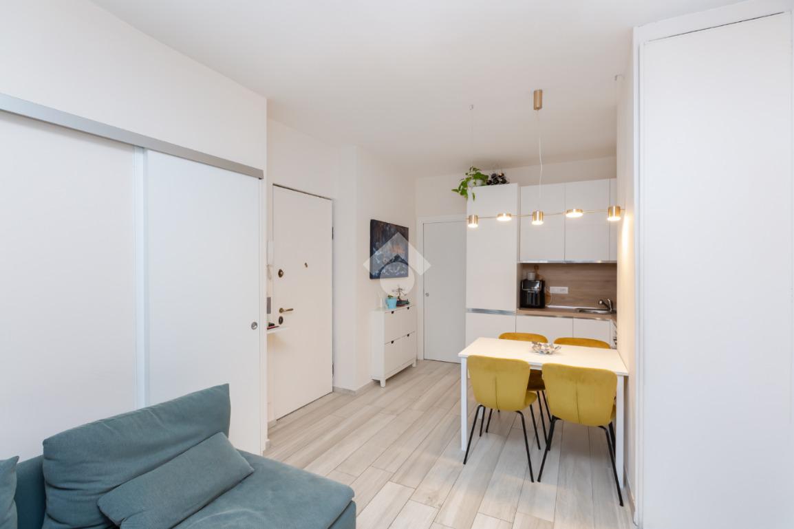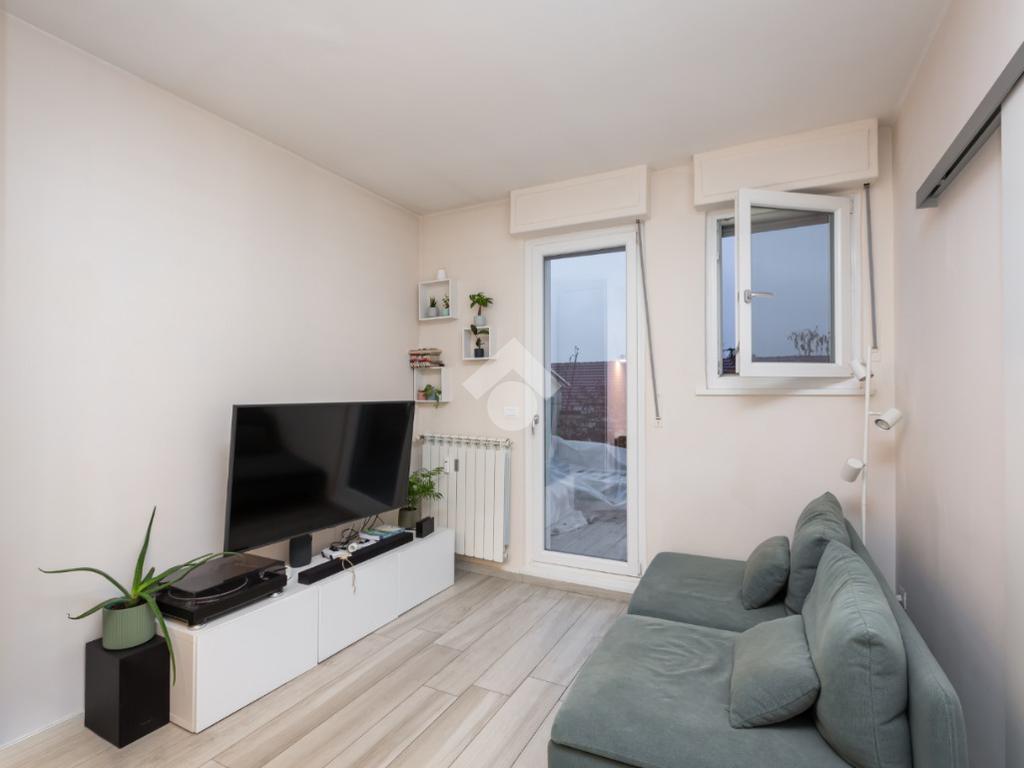 L'ingresso si apre sul soggiorno con cucina a vista che affaccia sul terrazzo che offre una piacevole vista sul quartiere e la possibilità di sfruttare lo spazio esterno nei mesi estivi.